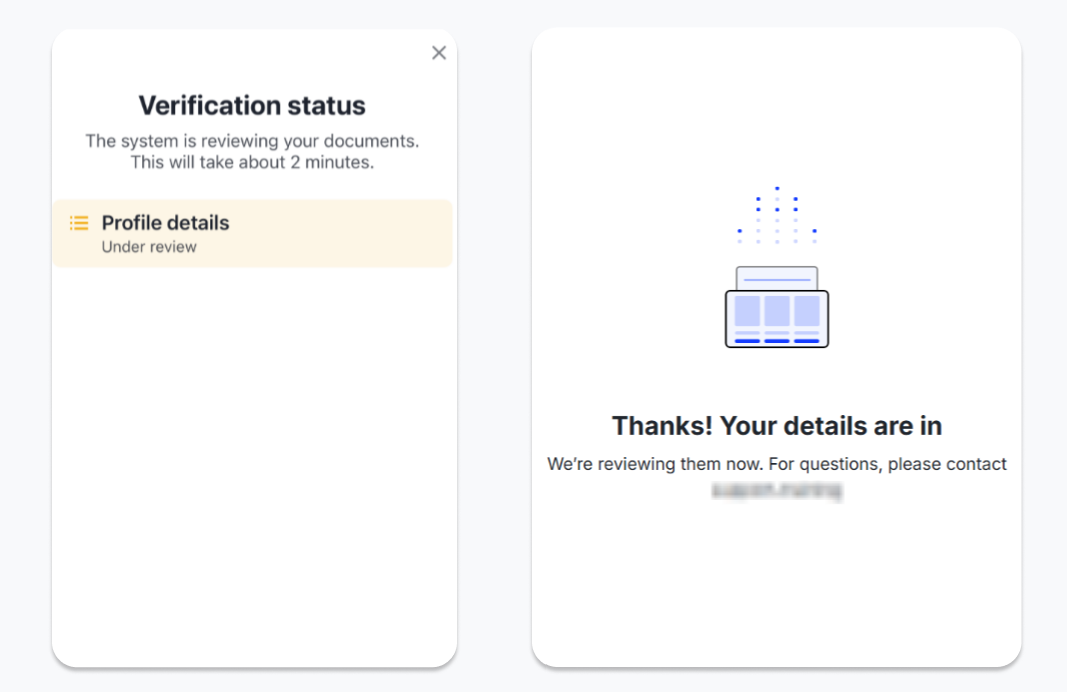 If you see a message: “The system is reviewing your documents.” or “ Thanks! Your details are in. We’re reviewing them now. ” - it means that the company you're verifying for is reviewing your profile.